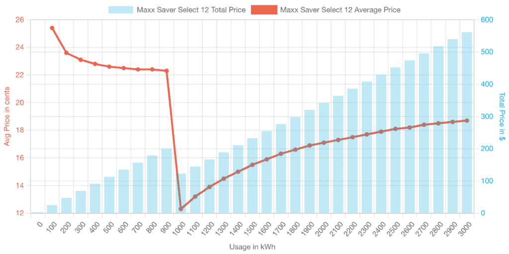 Maxx Saver Select 12 is designed for homes and apartments that use at least 1000 kWh of electricity each month. The chart above clearly shows the steep discount from the $100 bill credit once you hit 1000 kWh.