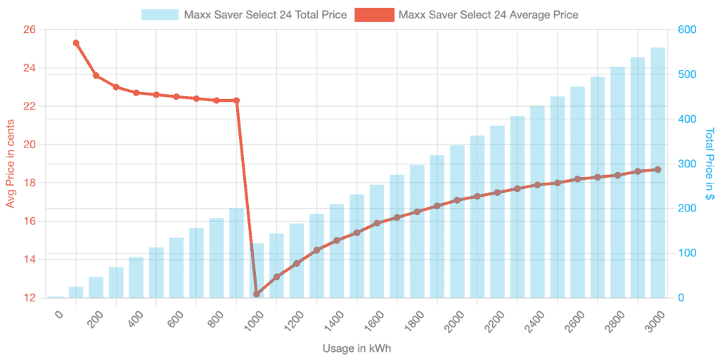 Maxx Saver Select 24 is designed for homes and apartments that use at least 1000 kWh of electricity each month. The chart above clearly shows the steep discount from the $100 bill credit once you hit 1000 kWh.
