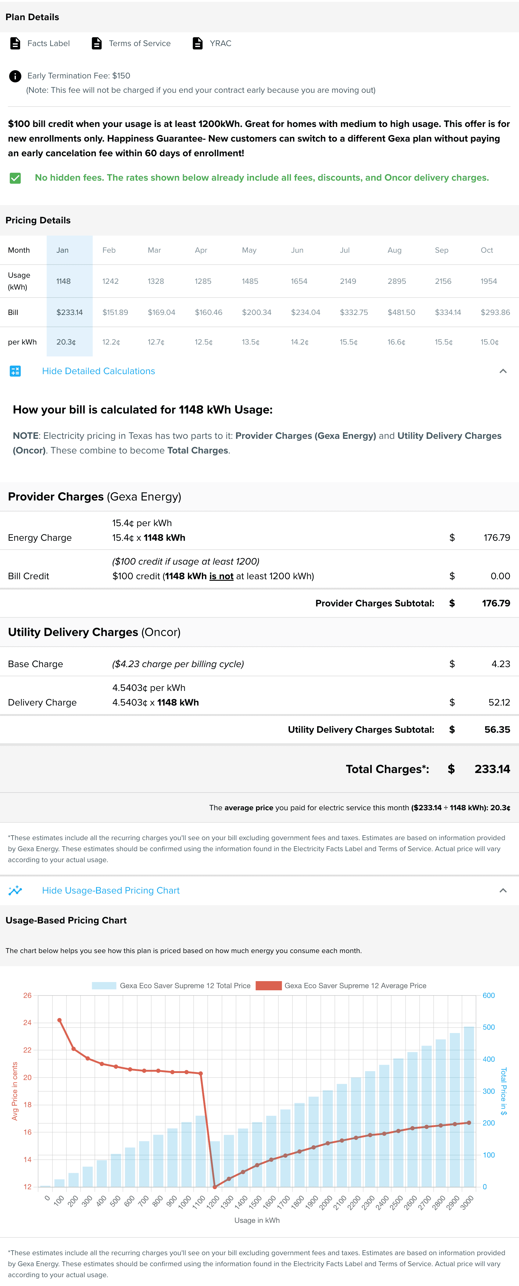 Get pricing details for your specific monthly usage, including total charges, the average price per kWh, and a detailed breakdown of how your bill is calculated.
