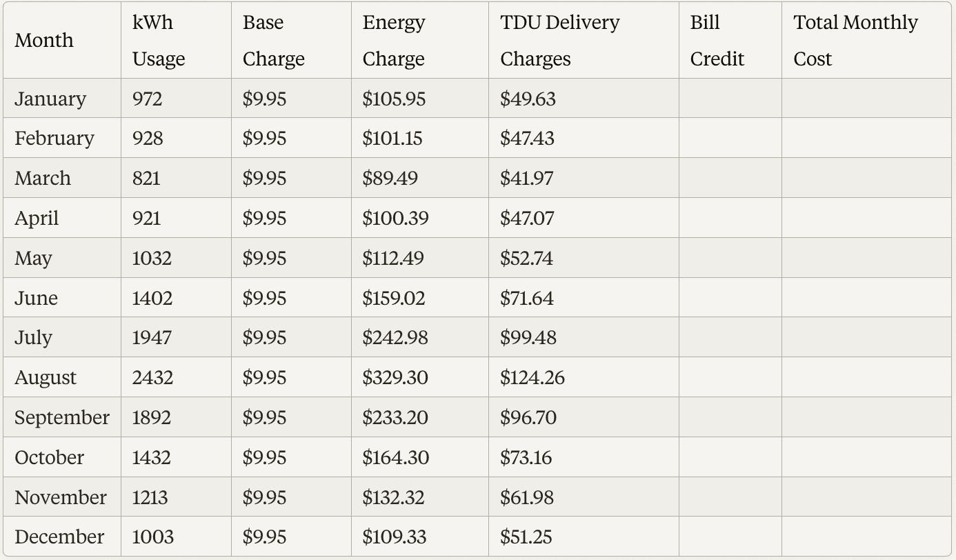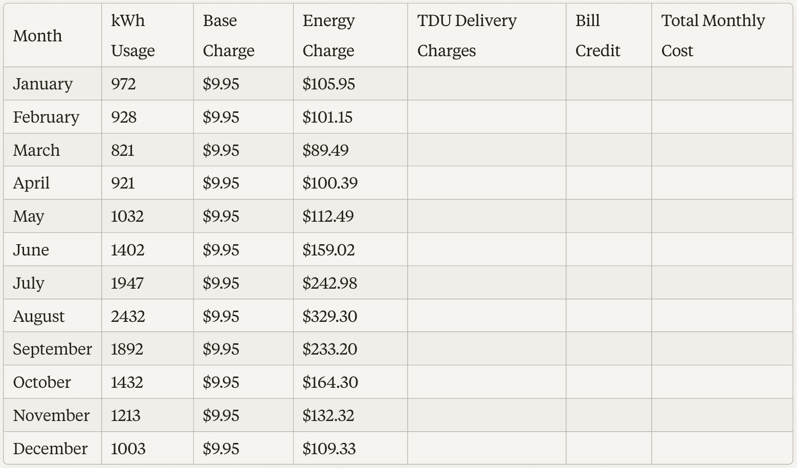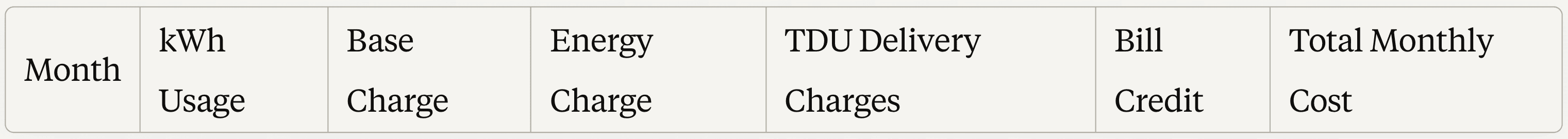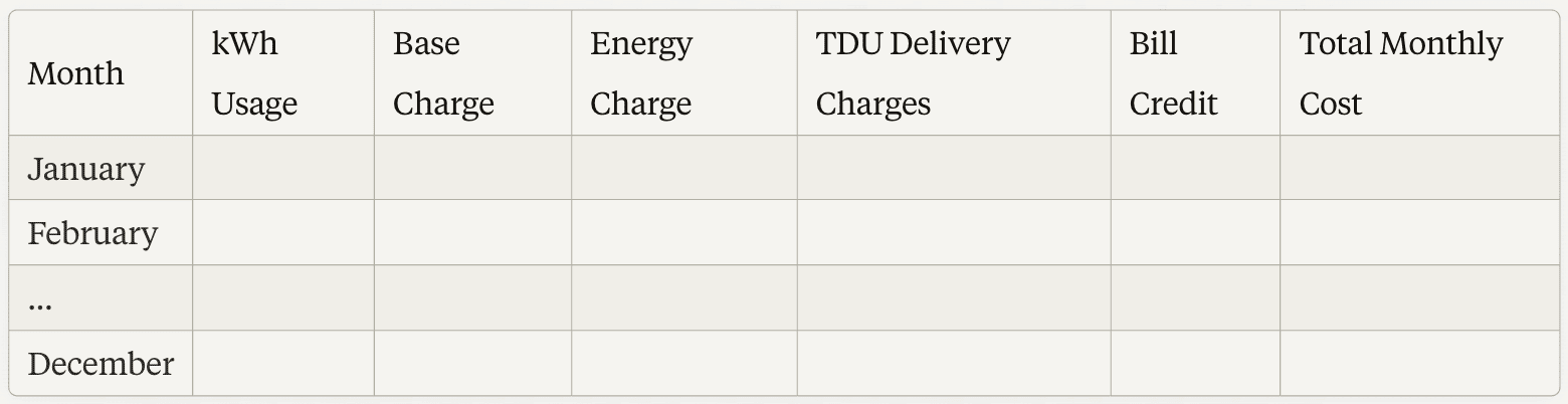 **a. Open a new spreadsheet and create the following column headers: Month, kWh Usage, Base Charge, Energy Charge, TDU Delivery Charges, Bill Credit, and Total Monthly Cost.