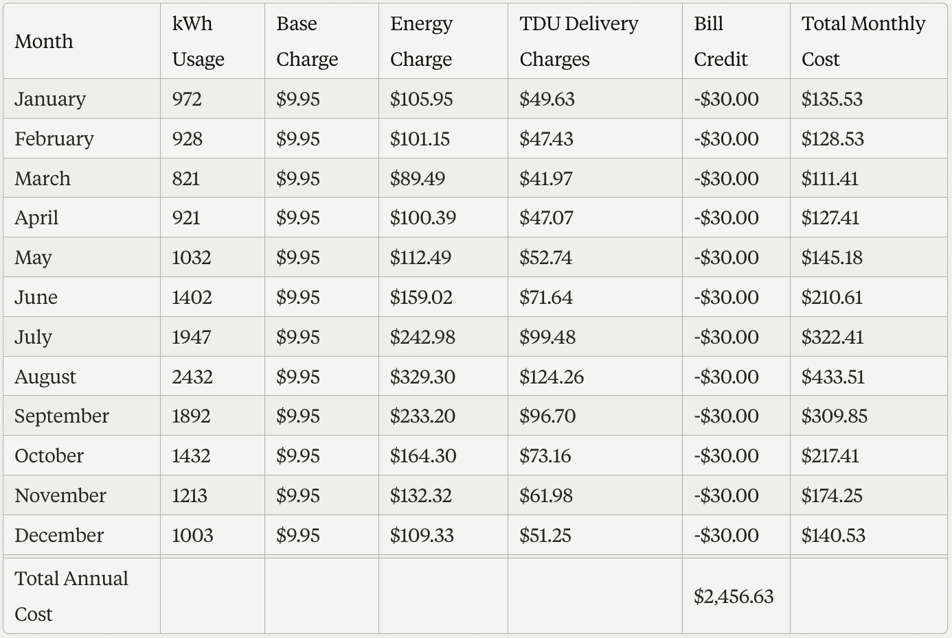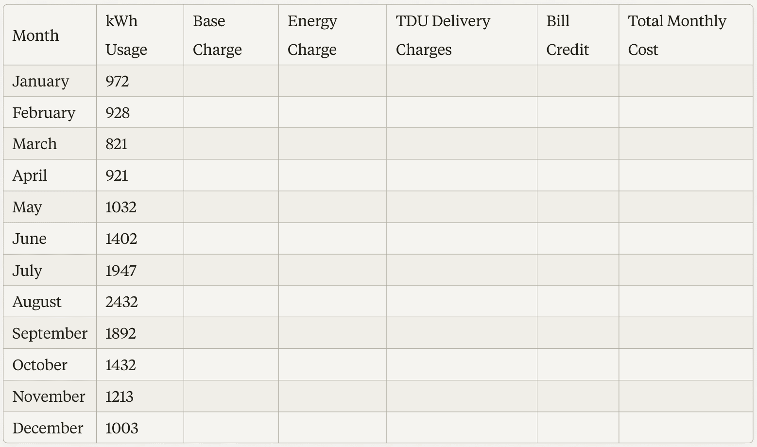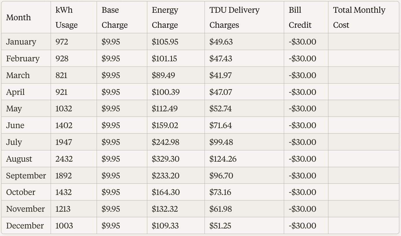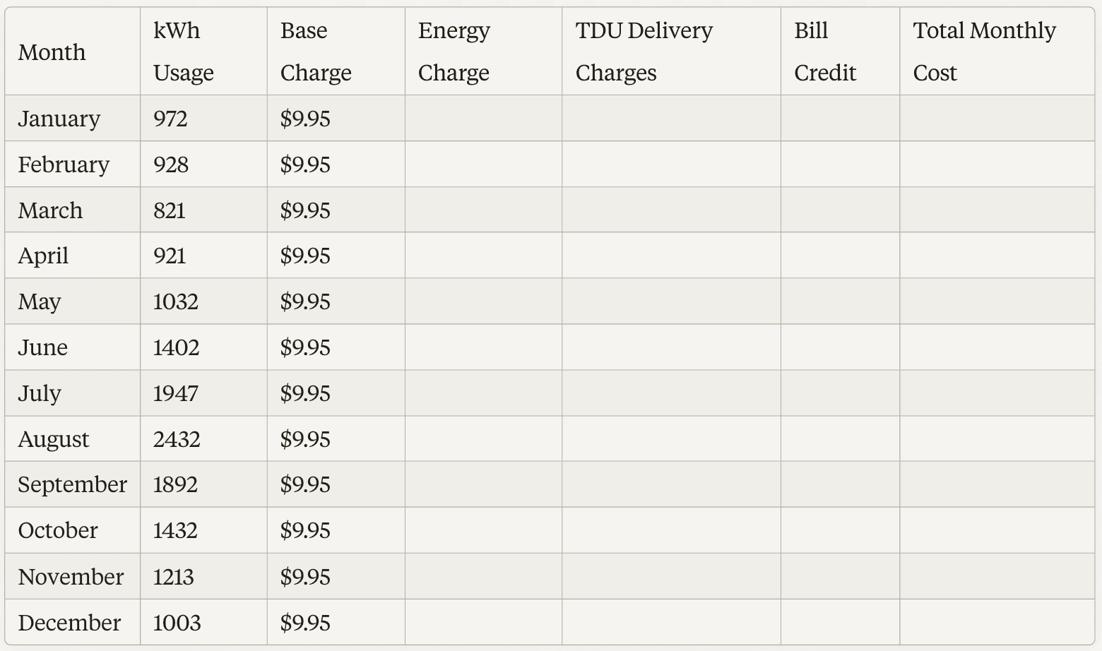 **a. Open a new spreadsheet and create the following column headers: Month, kWh Usage, Base Charge, Energy Charge, TDU Delivery Charges, Bill Credit, and Total Monthly Cost.